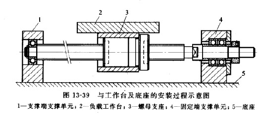 由于滾珠絲杠機構只是一種傳動部件,滾珠螺母只對負載工作臺提供一個直線運動的牽引力,工作臺的直線運動還需要專門的導向部件來導向,所以,滾珠絲杠機構一般是與直線導軌機構或直線軸承同時使用的,負載工作臺同時與滾珠螺母支座及直線導軌的滑塊(或直線軸承)裝配連接在一起,如圖13-38所示