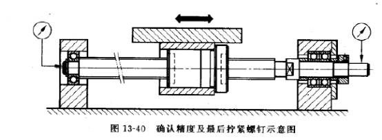 如圖13-40所示,往復轉動絲杠使工作臺左右往返移動,調整支撐單元的位置直到工作臺能夠隨導向部件(如直線導軌)進行平滑穩定的運動,如果出現運動不順暢現象就重復前面的調整步驟。用扭矩測試工具測試絲杠轉動所需要的扭矩,用千分表測試滾珠絲杠軸端的端面跳動及徑向跳動,一直調整到最佳狀態(上述位置度誤差達到最小轉動絲杠所需要的扭矩也最小),然后按滾珠螺母、螺母支座(或工作臺)、固定端支撐單元、支撐端支撐單元的順序將各連接螺釘最后擰緊。注意擰緊螺釘時應交叉進行。